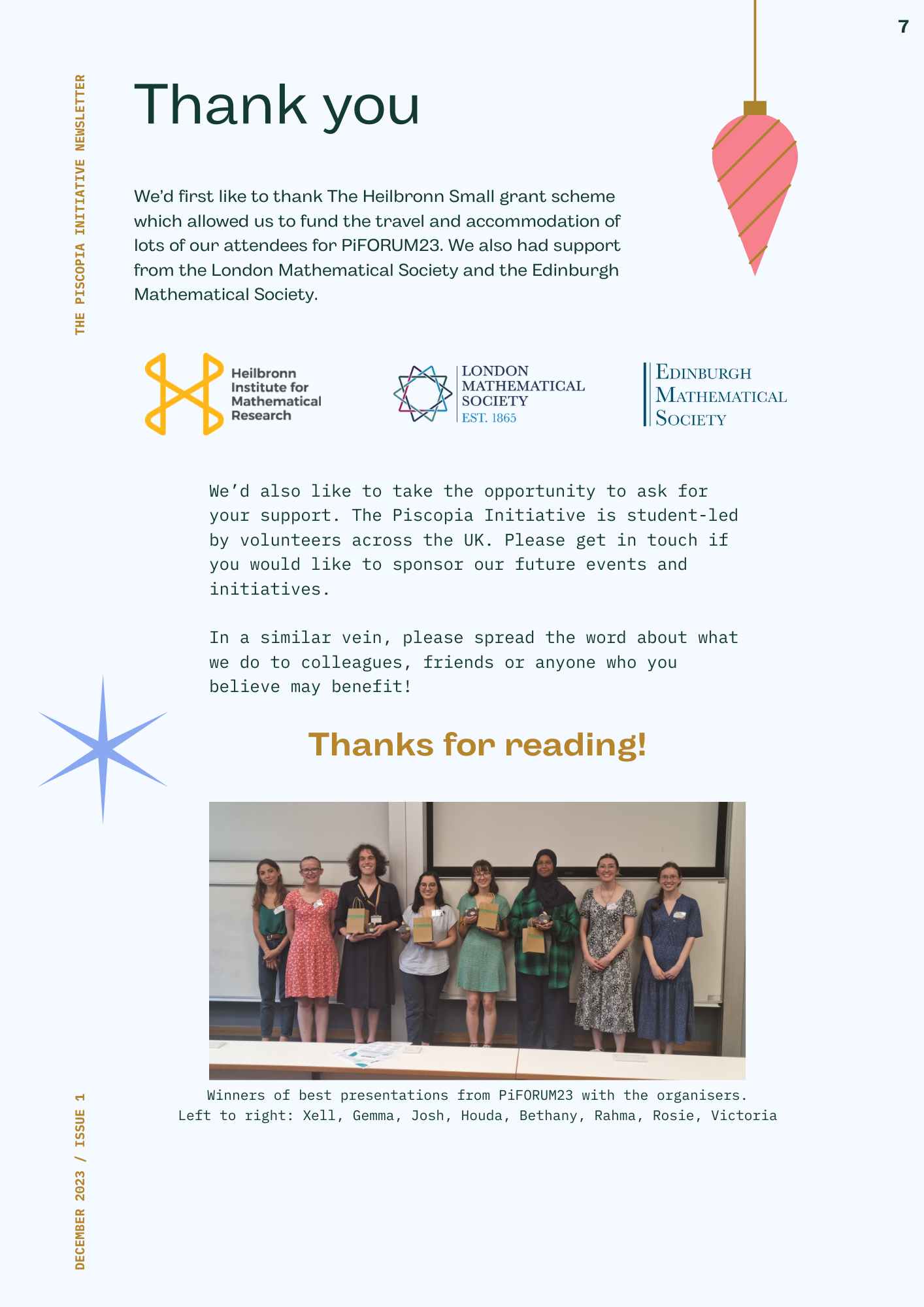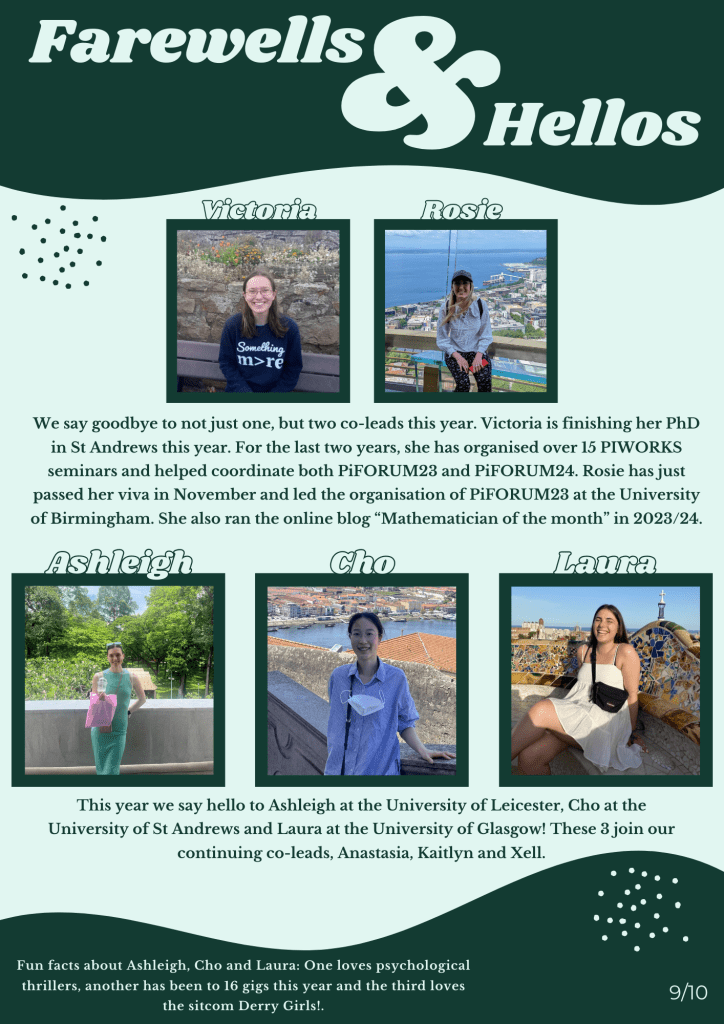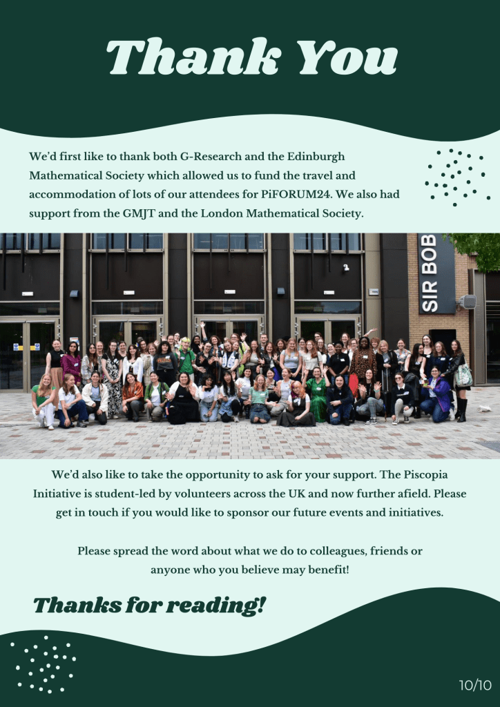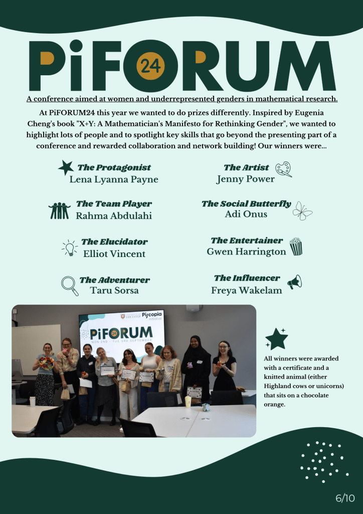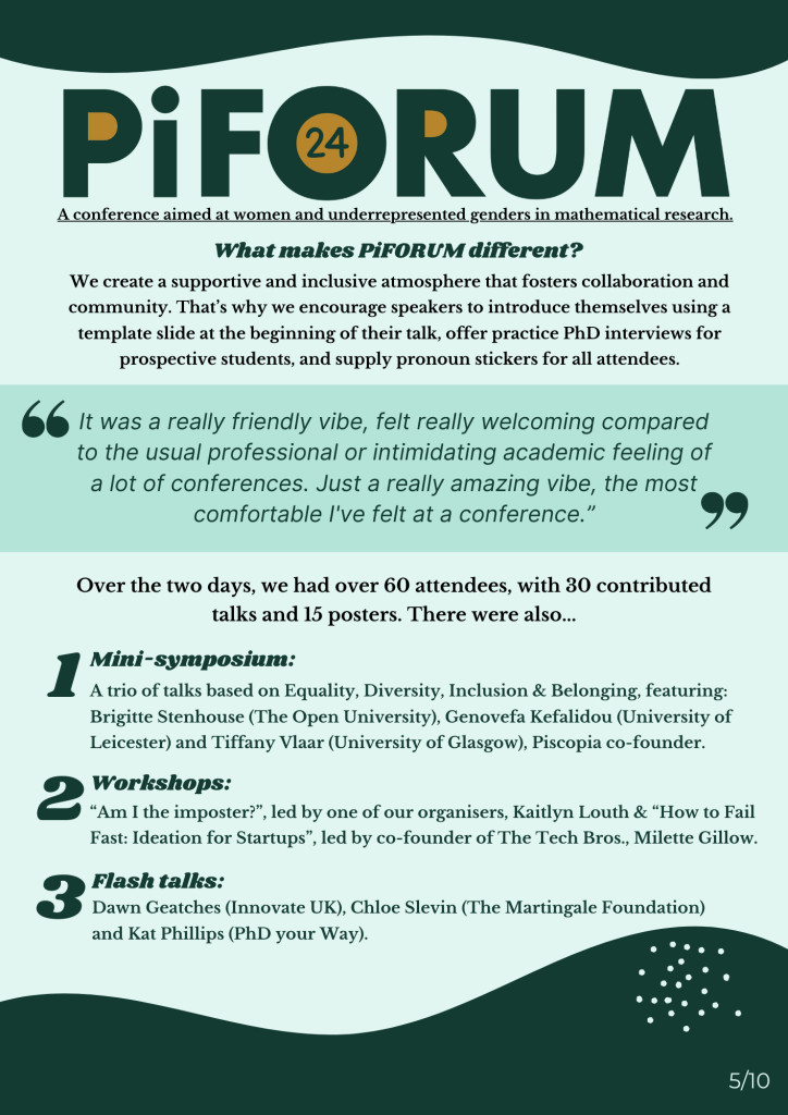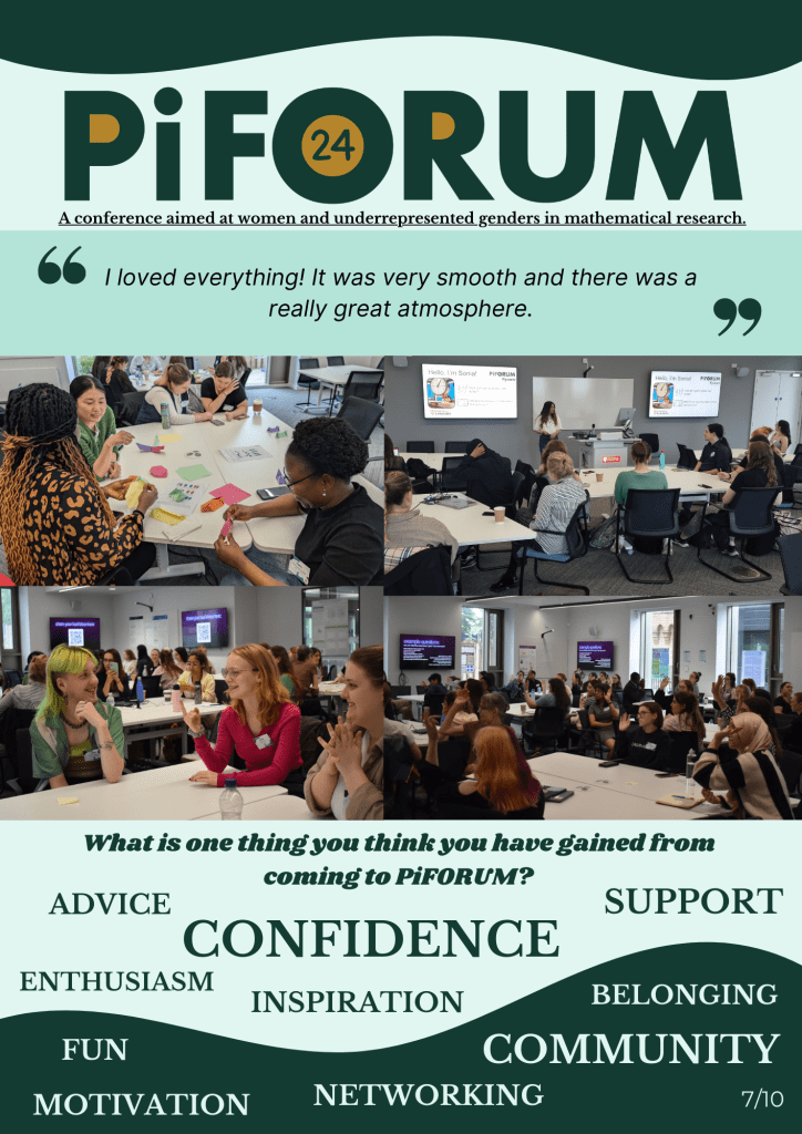 Finally, we have the annual PiFORUM conference that brings together members of the Piscopia community from across the UK to discuss mathematical issues and some of the challenges faced by gender minorities in Mathematics. In 2023, we held our conference in Birmingham, and the event consisted of short doctoral talks, career panels, discussions on challenges in academia, and a poster session.