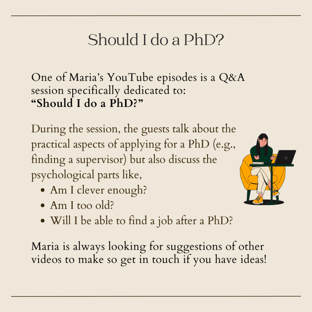 Maria’s YouTube channel can be found here! To watch the video on “Should I do a PhD?”, click here.