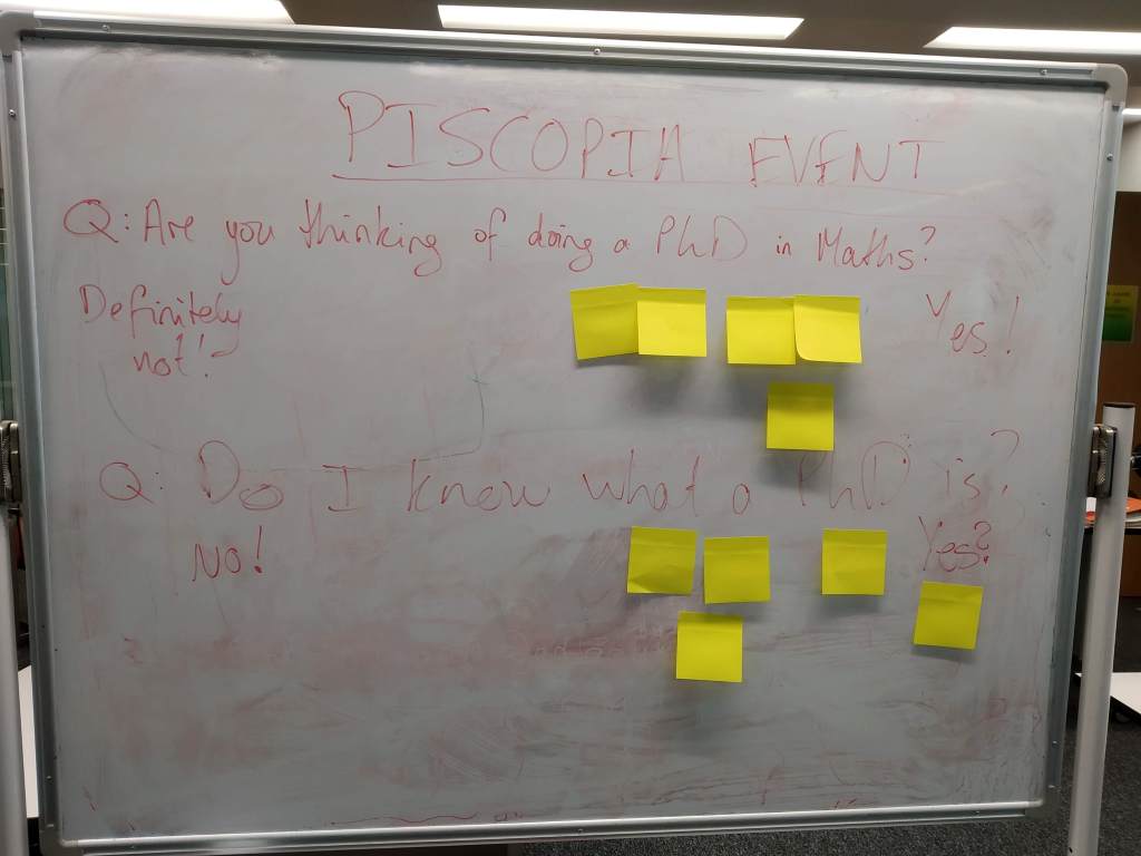 Warwick Piscopia committee hosted an event with speakers from the MathSys CDT, HetSys CDT, and the main mathematics CDT. Further, current PhD students at the University of Warwick discussed their PhD experience so far and gave application advice.