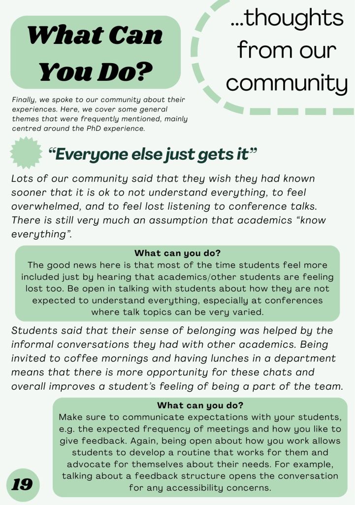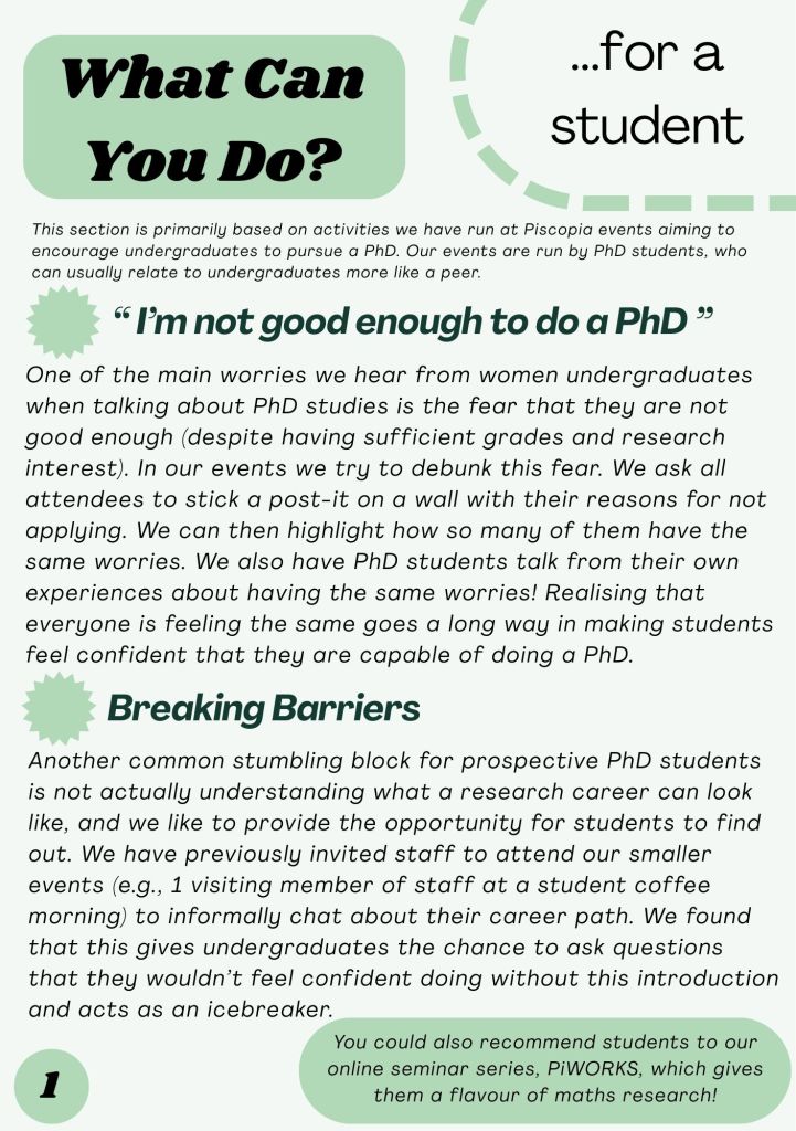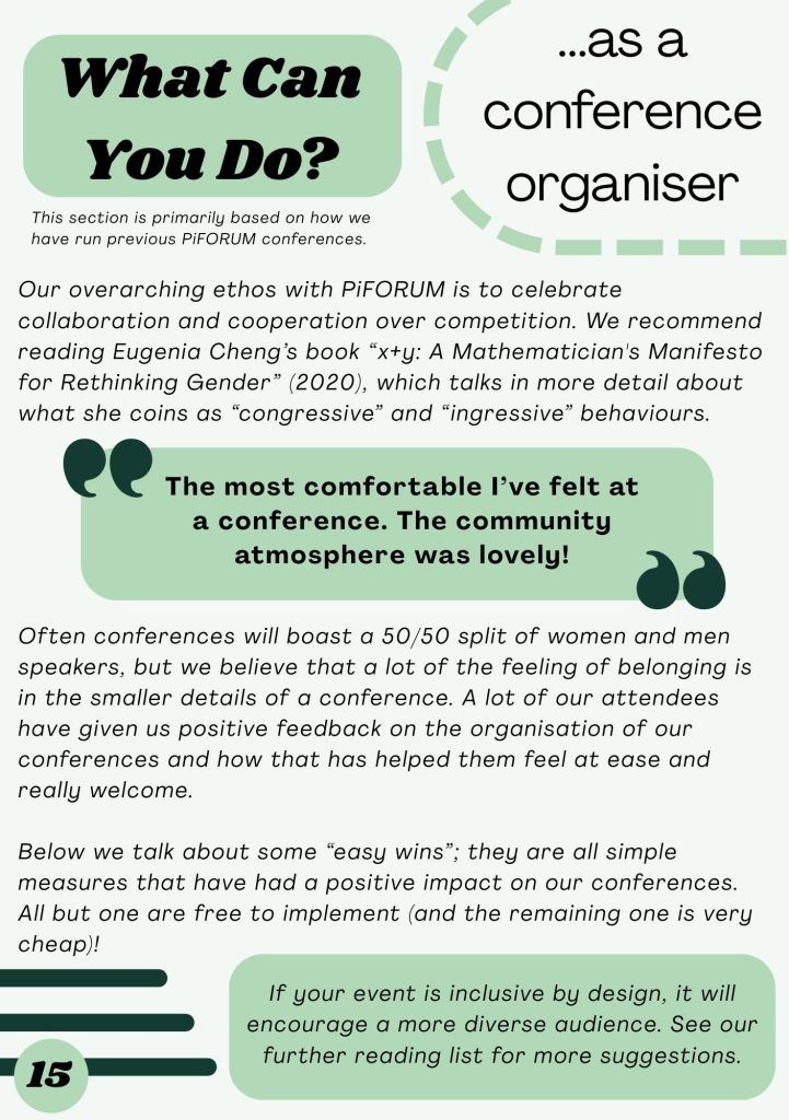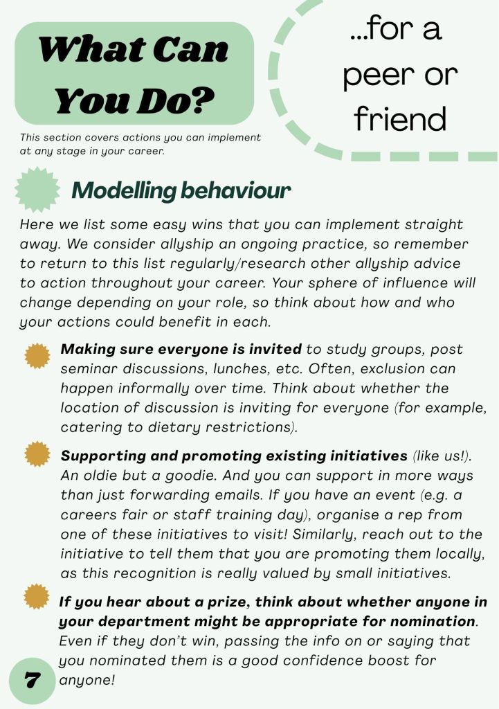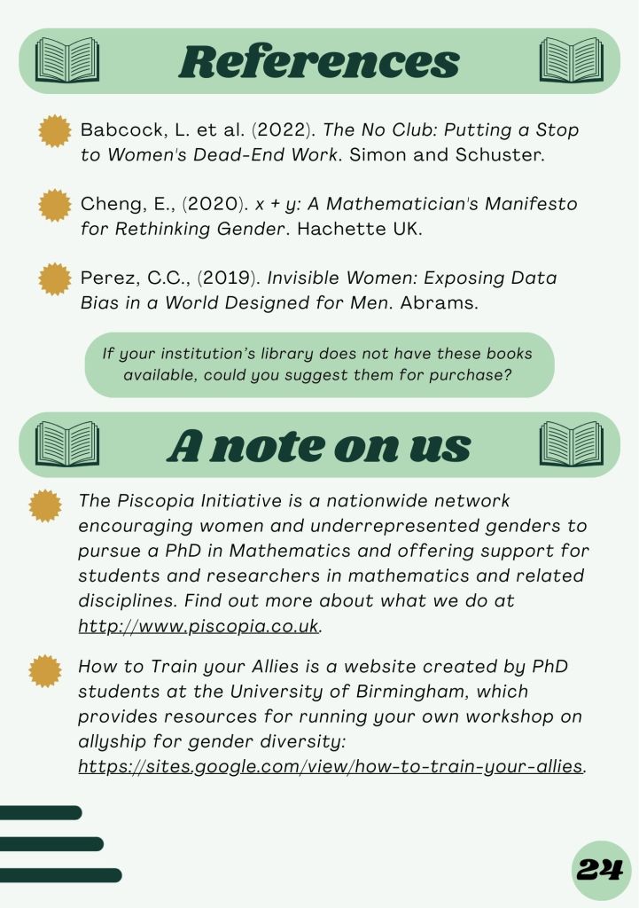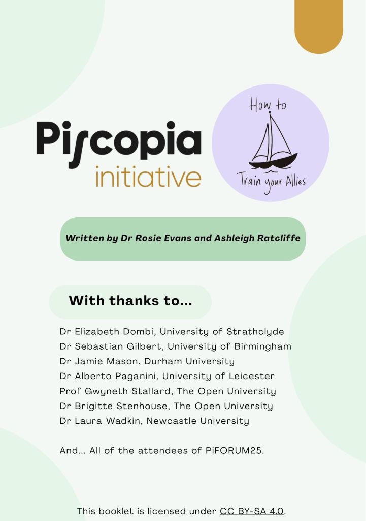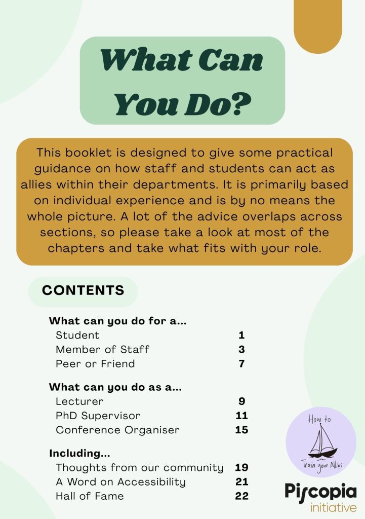 The advice has come from multiple sources: experience as a Piscopia co-lead, the “How to train your allies” group, Piscopia members and several academics from across the UK. The aim is that this booklet be made available online and to seek funding to print physical copies for distribution. If you would like to print physical copies, please get in touch with us as we can you send the professional printing version (with bleed and crop marks) and we would also like to keep track of the impact this booklet has had! Similarly, if you find this booklet helpful or have recommendations for future versions, please email us: