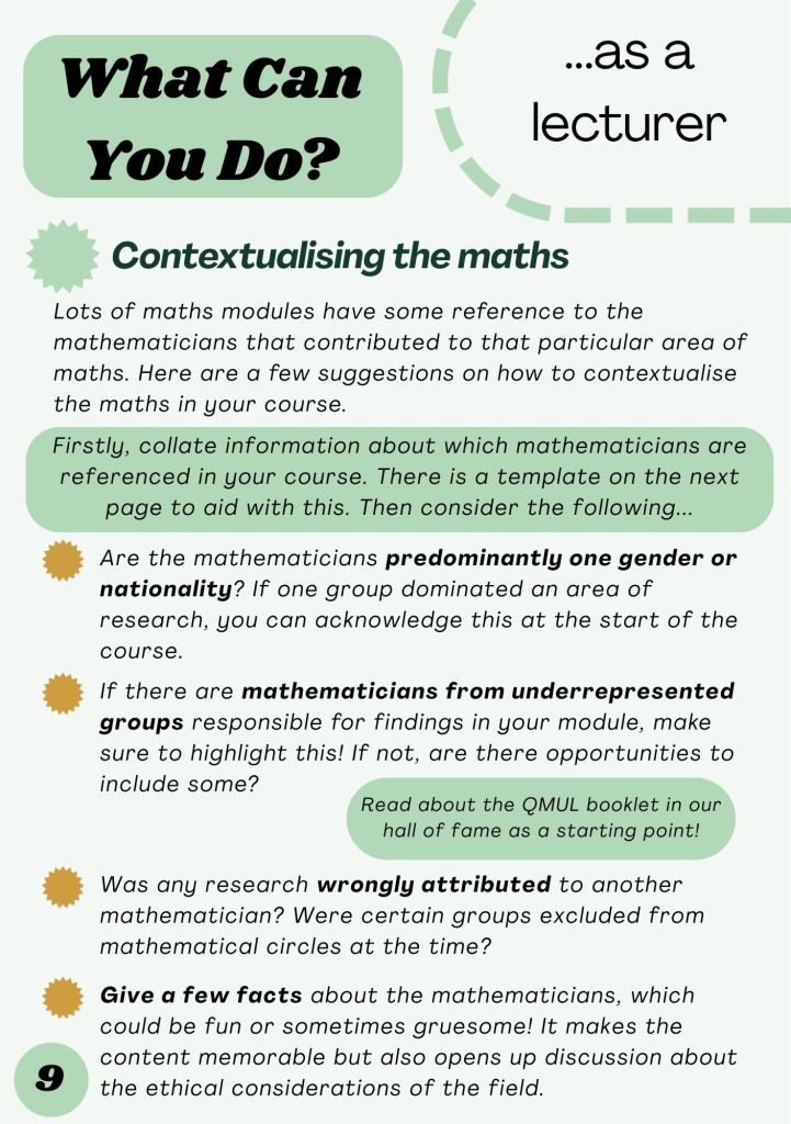 - The Queen Mary University of London project on Diversifying the Maths Curriculum. The EDI Resources available here include a booklet of biographies and posters to give visibility to engineers and scientists from under-represented groups.